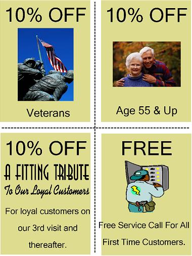 The following coupons may be printed to be used on your next service call. Call TODAY as these offers are only good for a limited time and availablity.